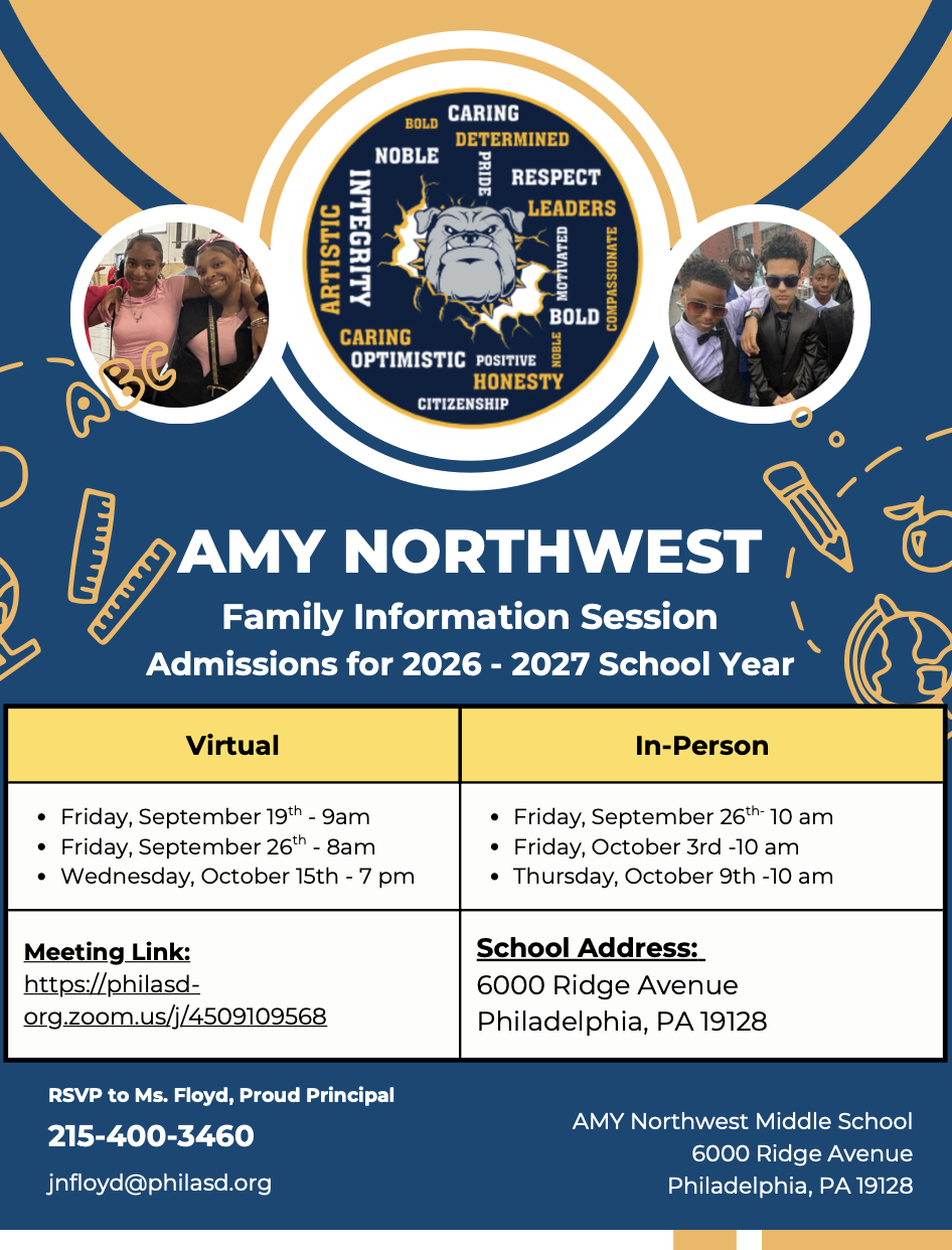 Be sure to visit the AMY Northwest website- https://amynw.philasd.org/ for important back-to-school information such as summer assignments and school supply lists. You can also find a list of vaccines your child will need to attend school on the school district website, www.philasd.org. If you missed orientation, the slideshow of information is also posted on the AMY Northwest website. I also invite you to attend our Back-to-School Night on Thursday, September 11th, from 6 pm to 8 pm. This will be a great time to meet teachers and other families, and learn more about the new school year. Additionally, we will hold our Annual Title I Meeting before back-to-school night on September 11th, from 5:30 pm to 6:00 pm. We are looking forward to seeing everyone on the evening of the 11th.